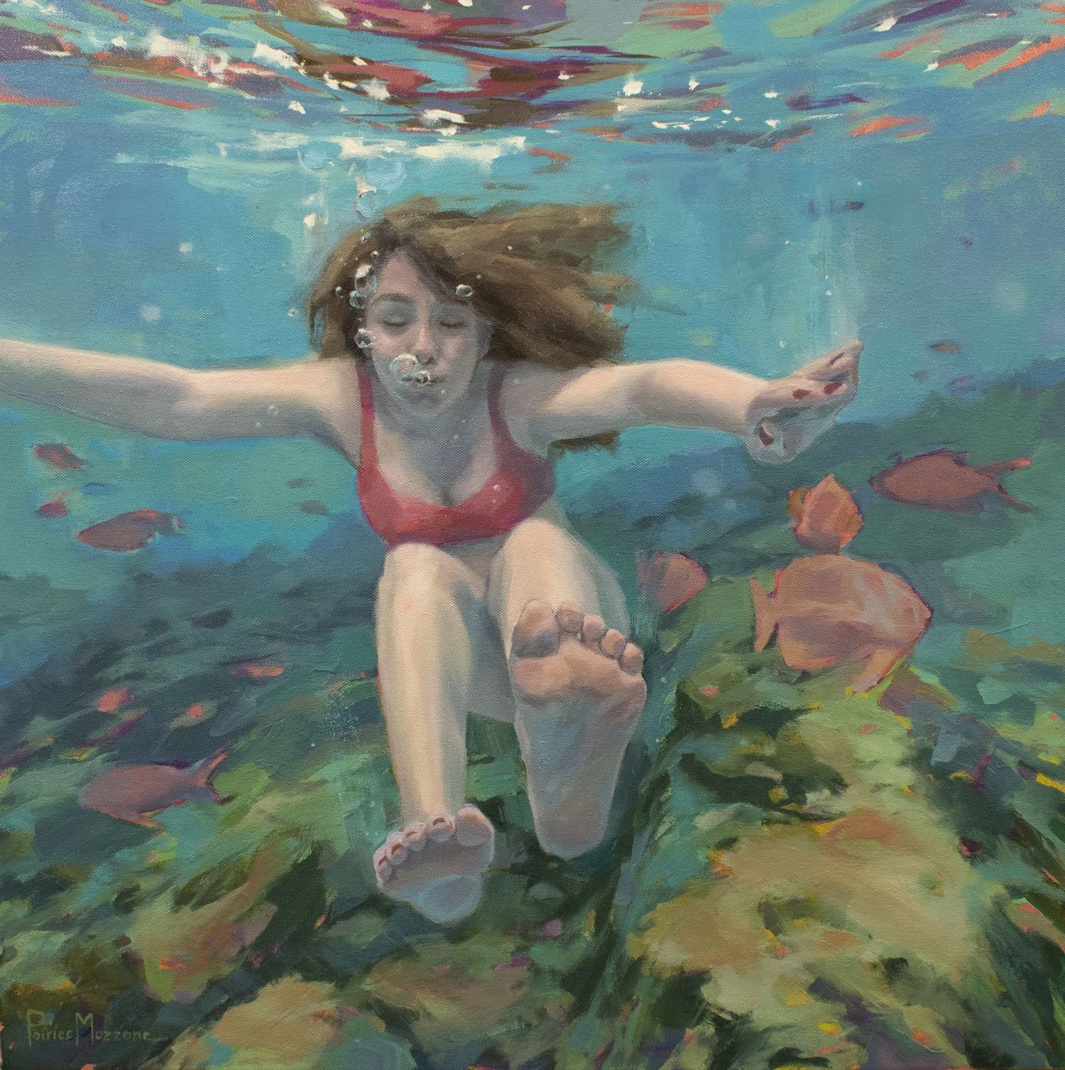 Exploring the human figure through the distorted lens of water captivates me. Not only because of my fascination with the subject matter but because the process of capturing it on canvas with strokes of color and texture feeds my soul.